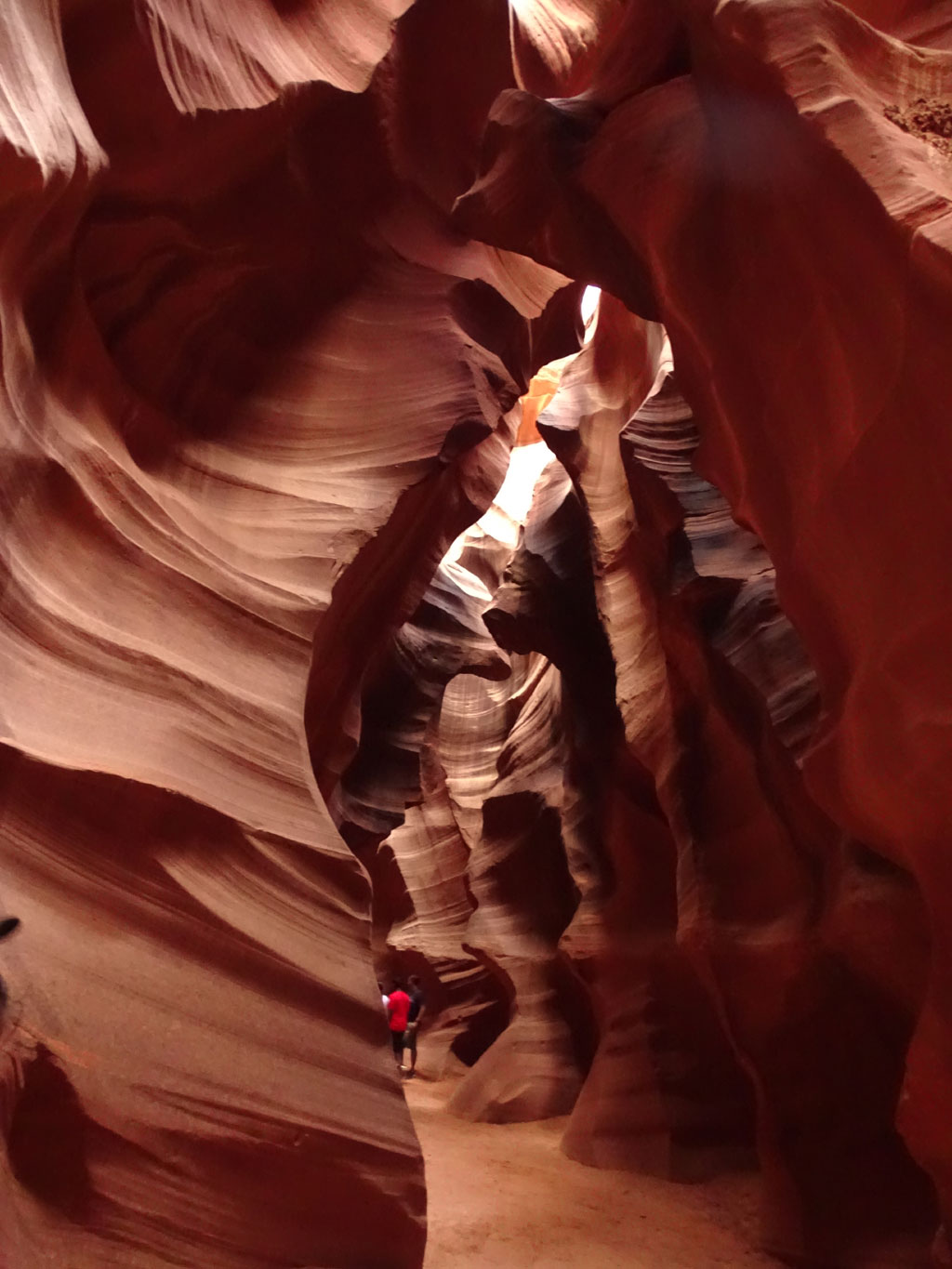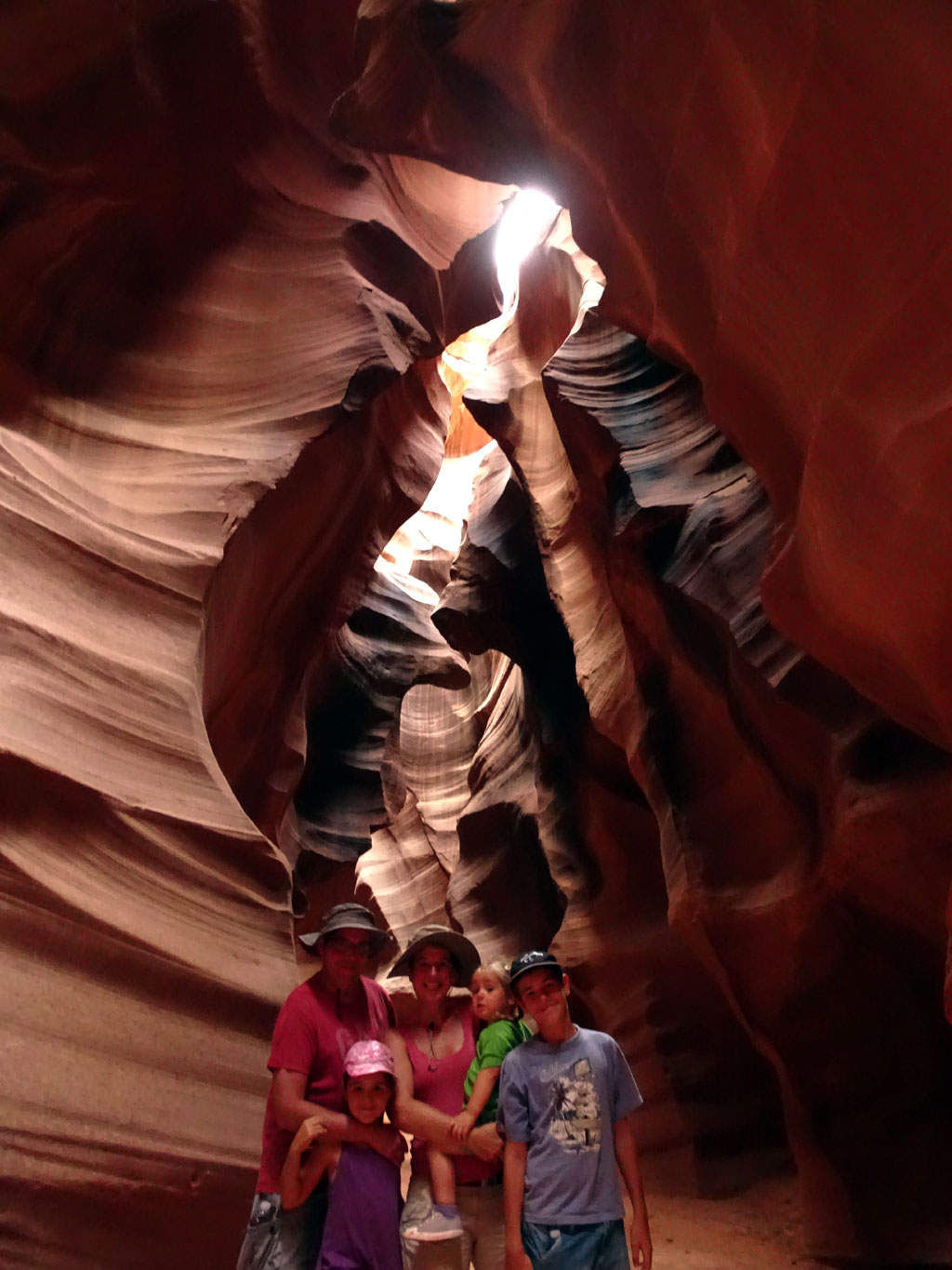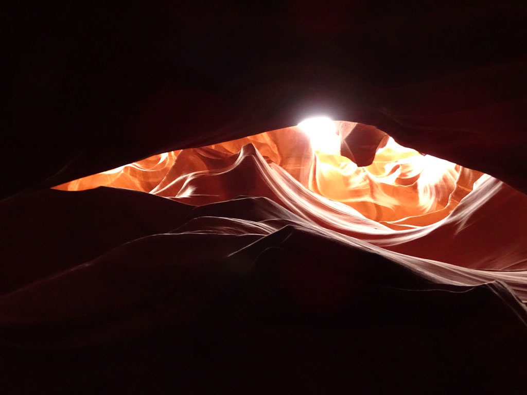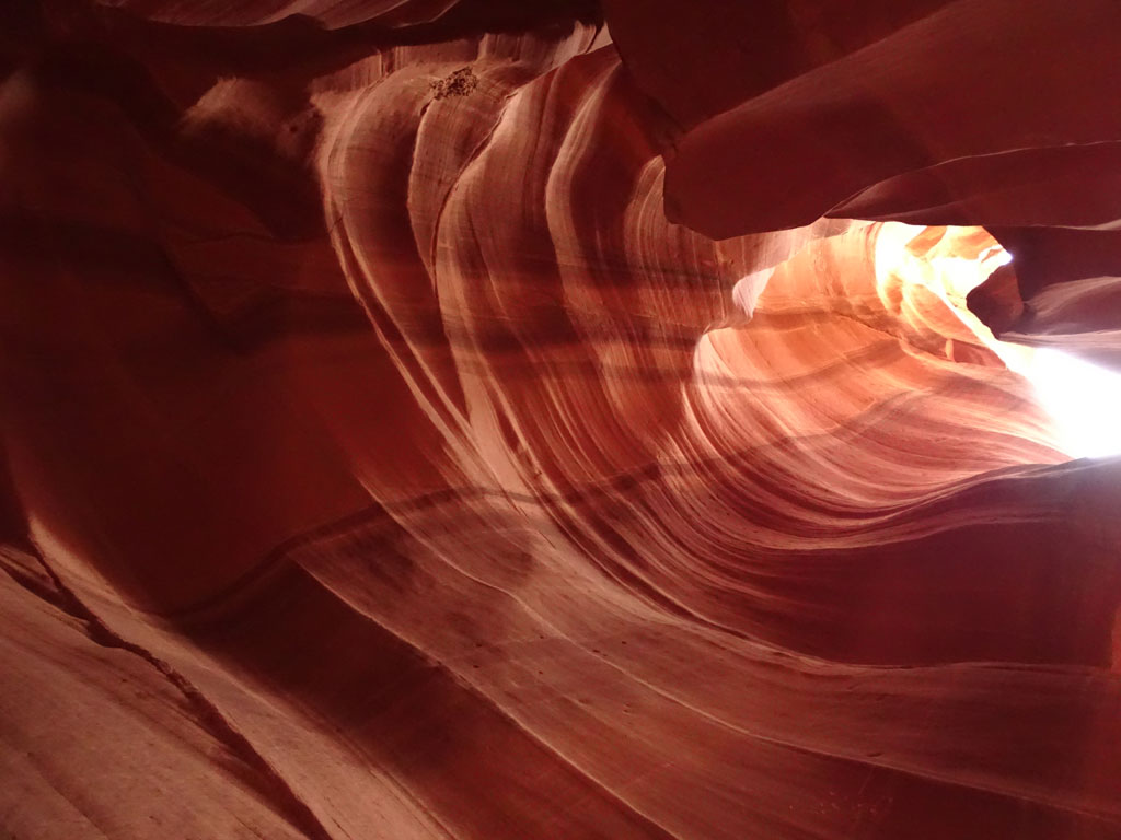 Avant de quitter la région de Page, nous partons découvrir Antelope Canyon, une curiosité de la nature située en territoire Najavo. Celui-ci n’est d’ailleurs accessible qu’avec un guide Navajo. Rendez-vous était donc pris pour une heure d’un safari photo où notre guide n’hésitait pas à prendre notre appareil pour nous montrer les meilleurs jeux de lumière possibles. Plus grotte que canyon, ce passage dans la terre mesure quelques centaines de mètres, avec des trouées à ciel ouvert de plusieurs mètres de haut. Si la visite peut rapidement s’avérer être une interminable file indienne (sans mauvais jeux de mots), une arrivée dès l’ouverture à 8h permet d’éviter la foule.