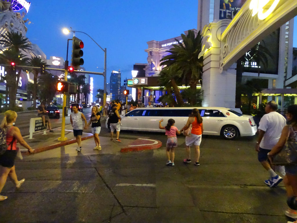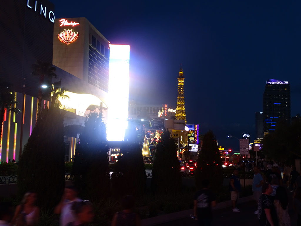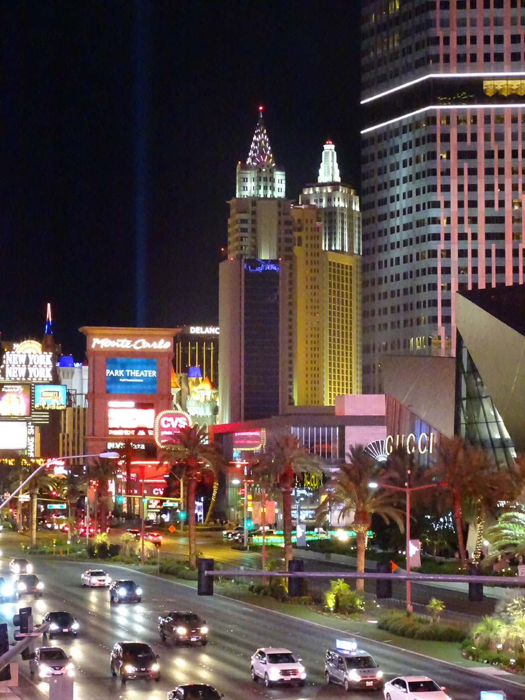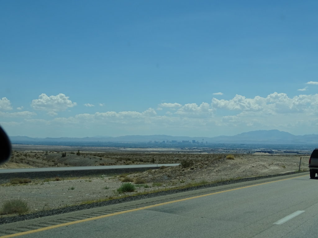 Trois heures de route et quelques 20 degrés supplémentaires, la ville de Las Vegas commence à se dessiner au milieu du désert… Et nous voici sur le Strip de Las Vegas avec notre camion (dénomination du camping-car pour Léane)… Même pas peur !