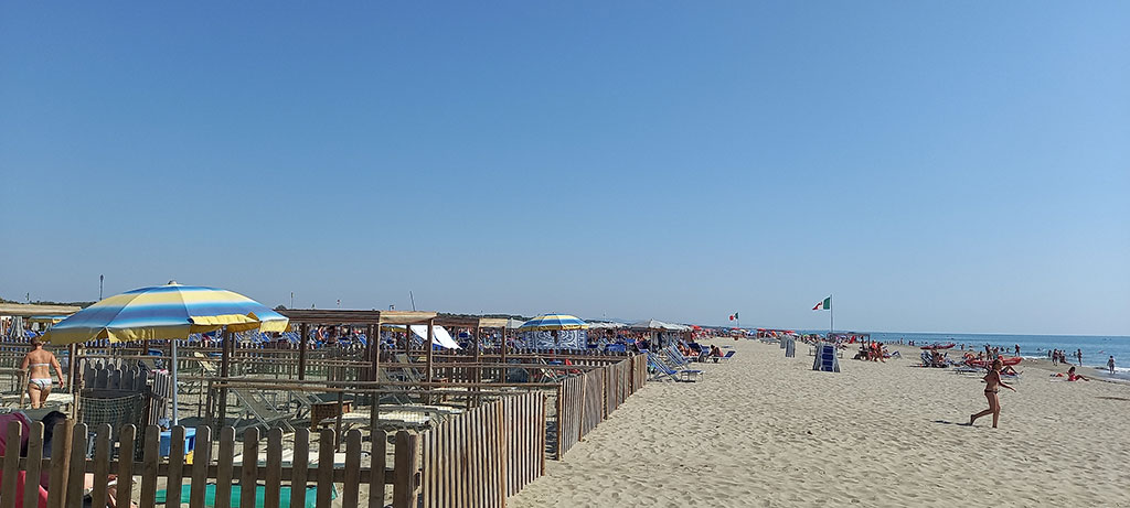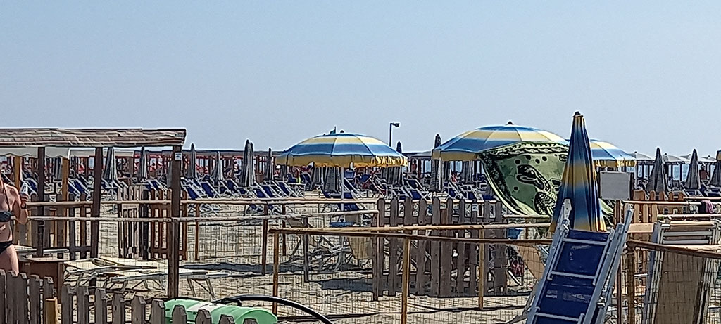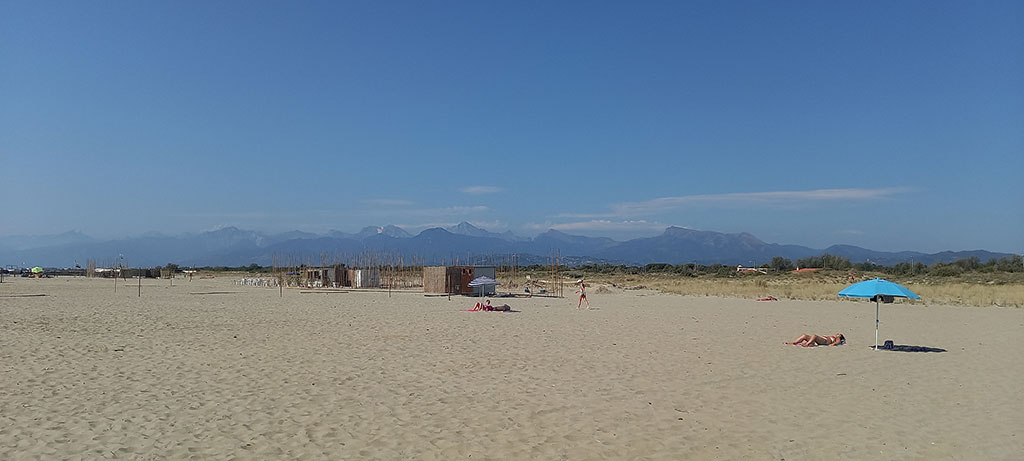 Les enfants souhaitant tester la plage version italienne, c’est sans grande attente que nous rejoignons la grande plage de sable de Torre del Lago pour une escale baignade. Des centaines de parasols alignés les uns à côté des autres, séparés par des cordelettes covid oblige, ne sont pas très engageants. La vue sur les dunes et les montagnes en fond le sont nettement plus.