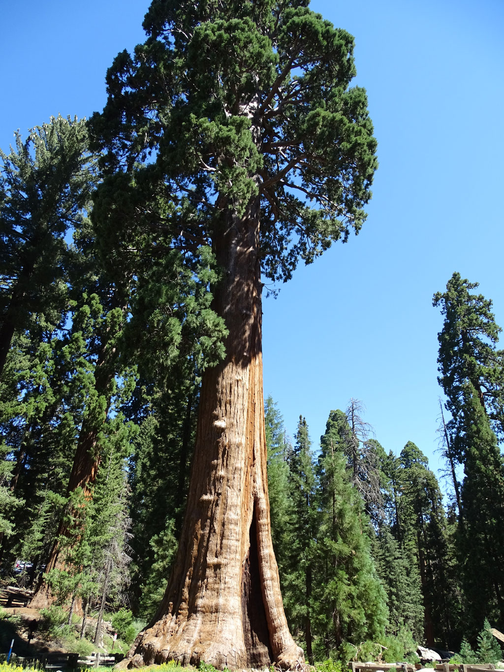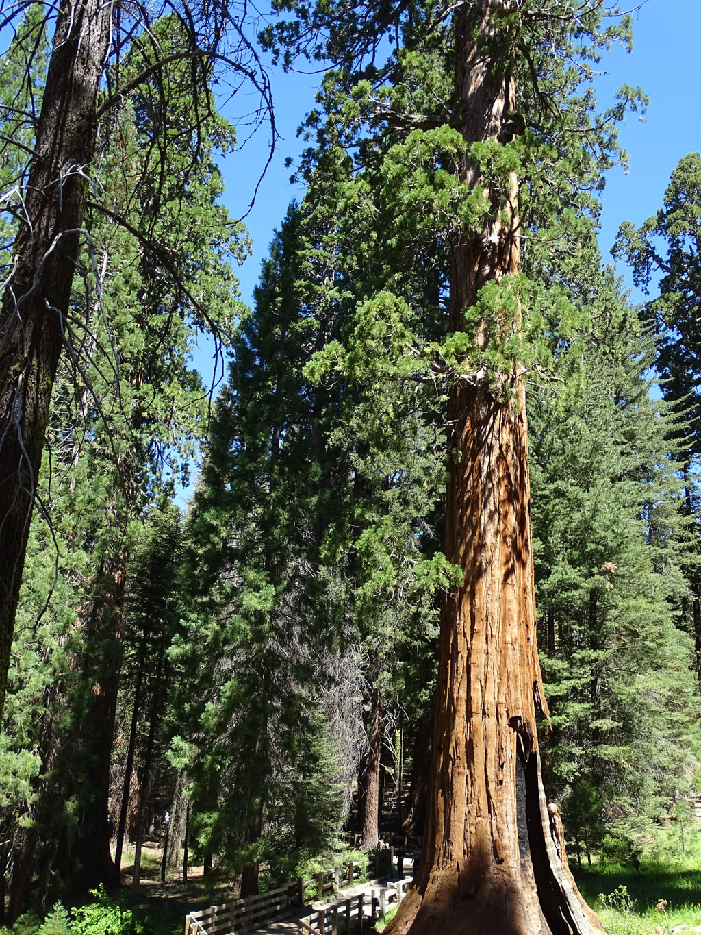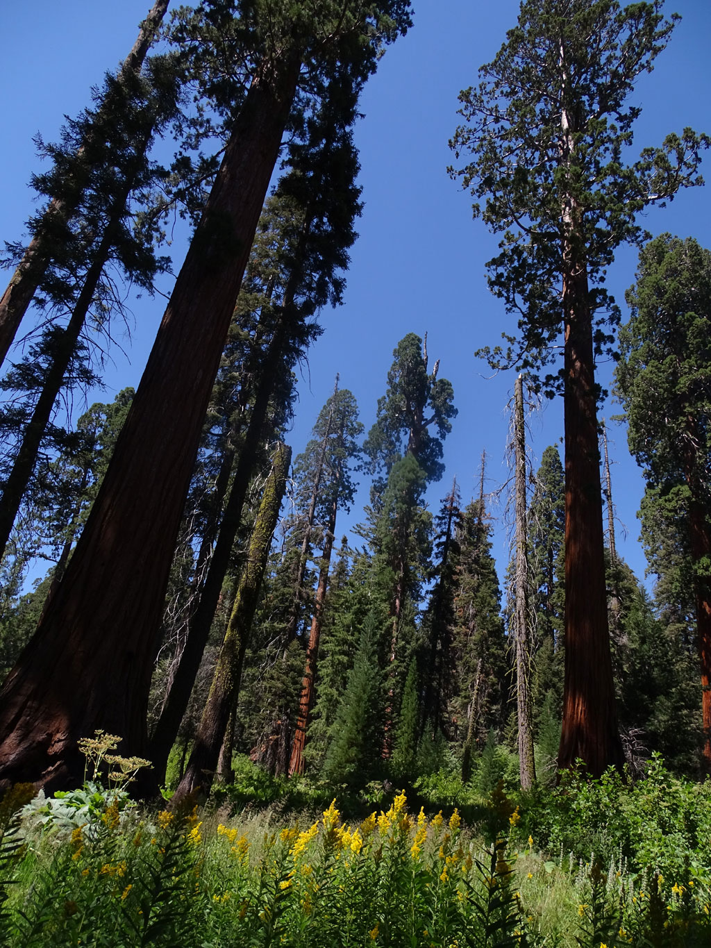 La visite de Sequoia Park avec un camping-car n’est pas pratique, même impossible par endroit. En effet, le seul accès possible pour les véhicules de plus de 7 mètres (22′) (nous en faisons 9 soit 30′), c’est par le nord. Loupé, notre camping est situé à l’accès sud. Enfin pas si loupé que ça car nous avons pu prendre une navette qui nous a emmené, moyennant quand même 15 $ par personne, au cœur du parc. Après une heure d’une route de montagne où l’on comprend très vite pourquoi les camping-cars sont interdits (j’ai fermé les yeux et serré les… un bon nombre de fois), nous voilà au cœur de la forêt des géants. Des arbres faisant jusqu’à 30 mètres de circonférence et 80 mètres de haut nous entourent. Les yeux en l’air mais les pieds bien sur terre, nous arpentons les sentiers du parc, en naviguant en navette (gratuite cette fois) d’un point à l’autre.