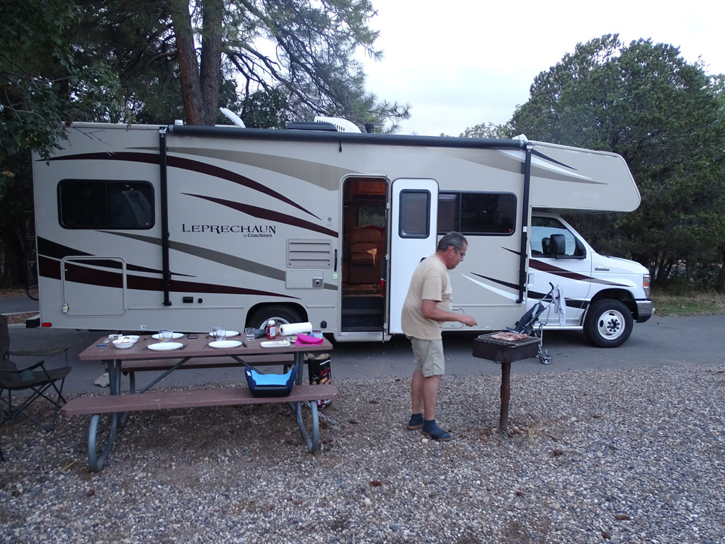 A peine le RV stationné que les enfants aperçoivent des biches en face : fabuleux. Dîner avec des côtes de bœuf angus à l’américaine – un régal -, puis couché des images plein la tête avant d’attaquer les randonnées demain !