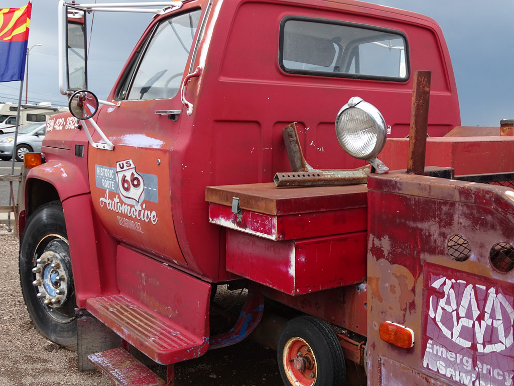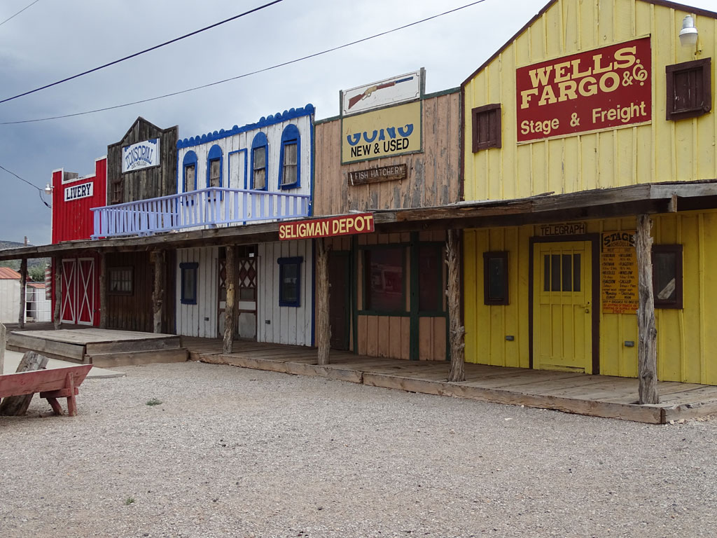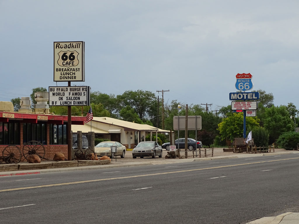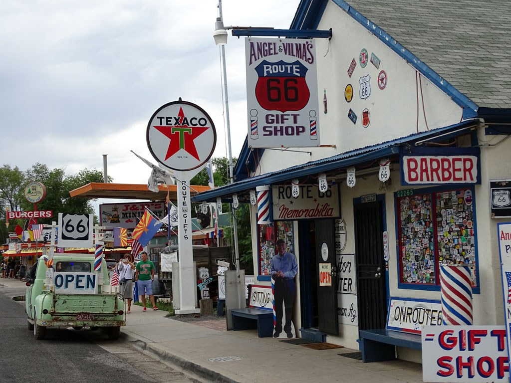 405 kilomètres nous séparent du premier parc à visiter : le Grand Canyon. Nous quittons très vite l’autoroute pour suivre la fameuse Route 66, route historique qui traverse les Etats-Unis d’est en ouest. Une ambiance particulière habite cette route, où nous croisons des villages d’un autre temps, entre vestiges d’une époque révolue et décors pour touristes. Les enfants ont l’impression d’être dans le film Cars alors que les parents sont plutôt dans l’ambiance Bagdad café (chacun ses références).
