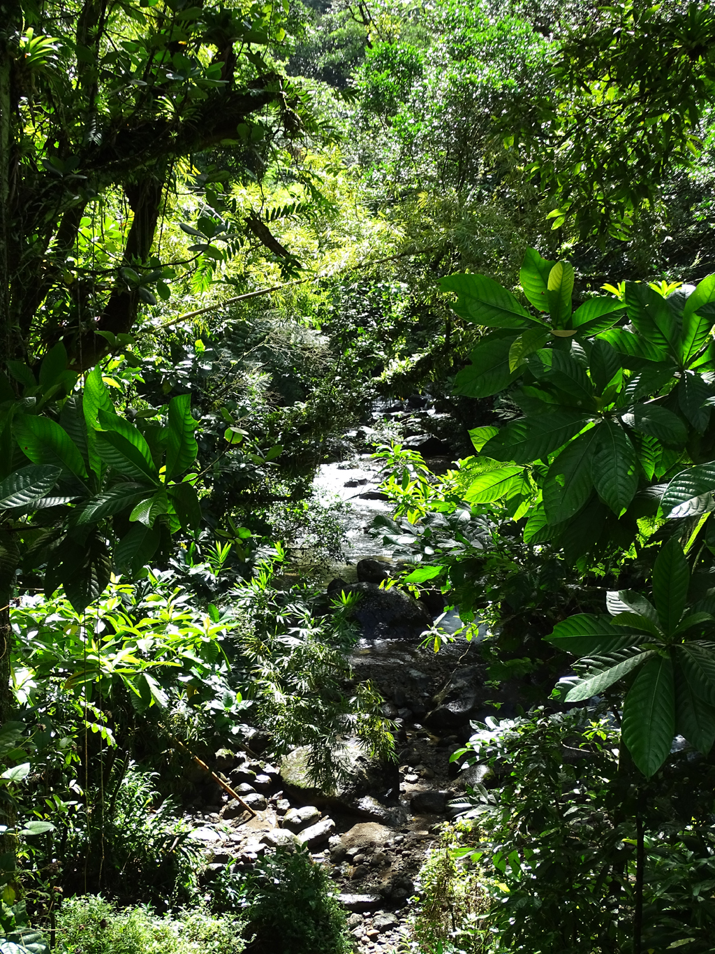 Nous poursuivons à la recherche d’un endroit pour pique-niquer avant de rejoindre la côte. Si la cascade du Saut-Gendarme nous tendait les bras, trop de voitures sur le petit parking nous a fait passer notre chemin. Quelques centaines de mètres plus loin, nous trouvons un petit parking vide et aménagé d’une table au cœur de la forêt tropicale.