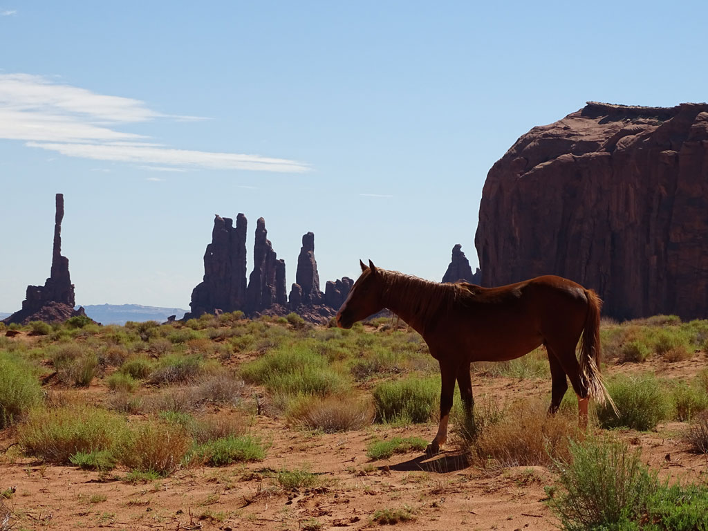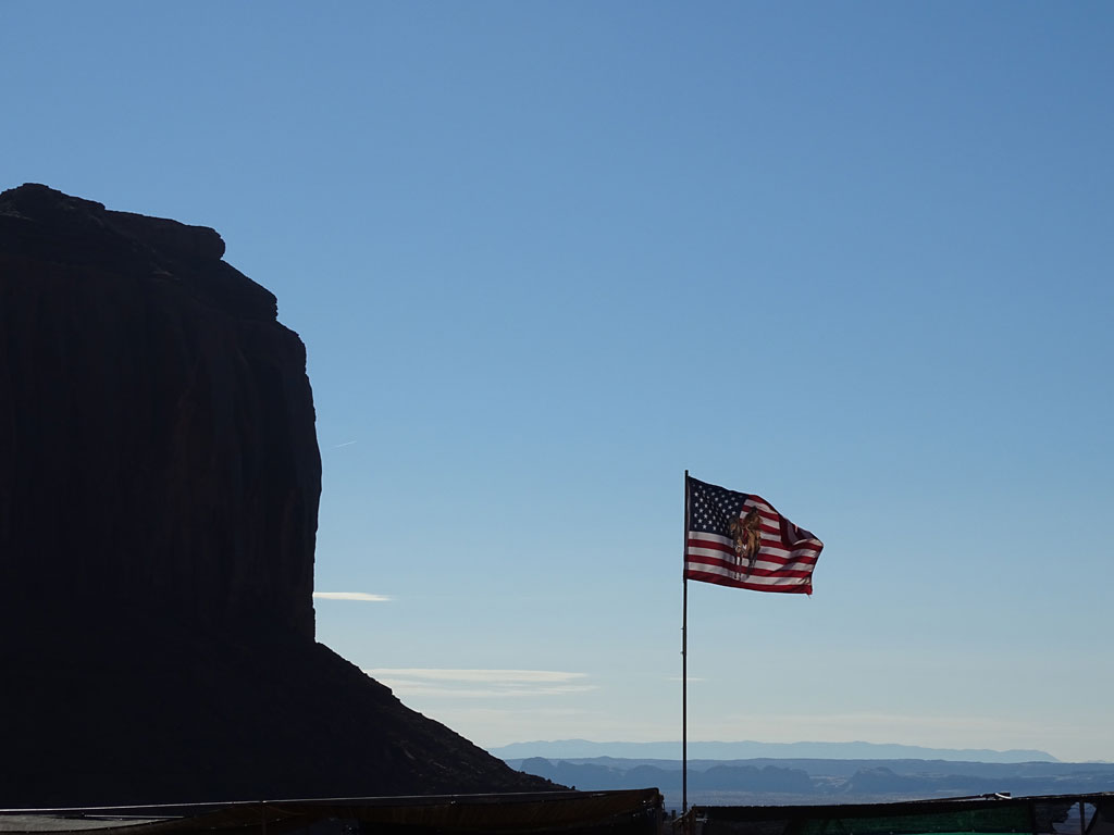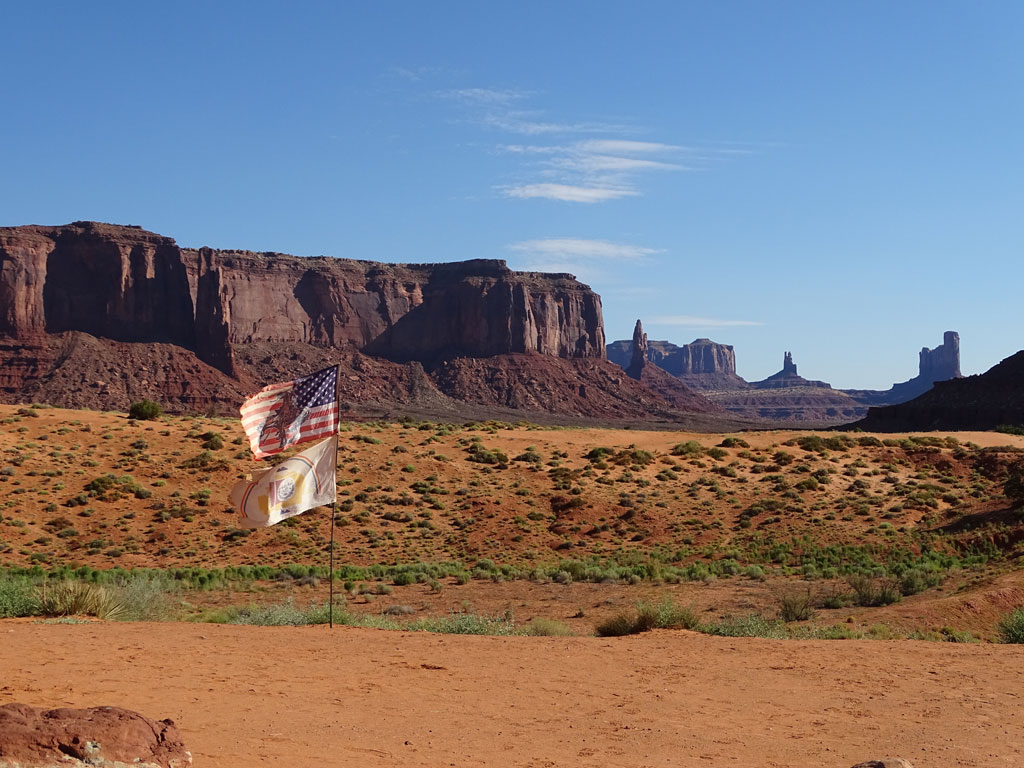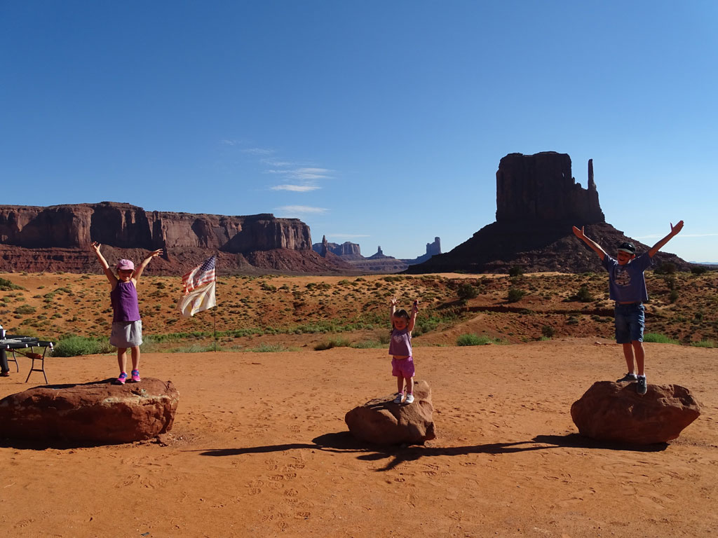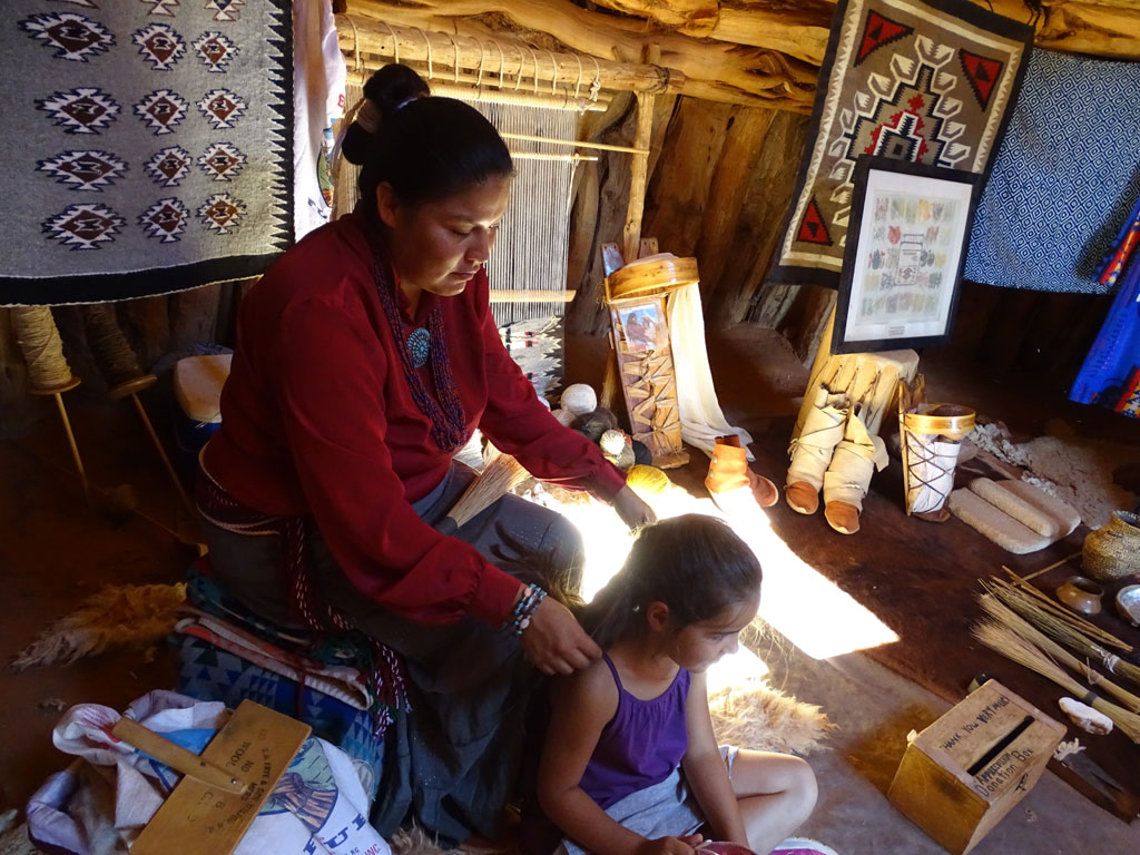 Rencontre avec Harry, notre guide Navajo pour cette matinée. C’est parti pour 2h30 de tout terrain dans la terre rouge et chaude des indiens. Passés les quelques points accessibles aux plus téméraires avec leurs véhicules personnels, les incontournables vendeurs d’artisanat local et LA photo au « John Wayne’s Point », nous allons plus loin, sur des pistes moins praticables. Points de vue moins vus que les autres, visite d’une habitation traditionnelle où Léane peut jouer à la poupée avec des jeux indiens, Maëlle bénéficier d’une coiffure typique par une indienne Navajo, alors que Malo écoute les explications sur les différents outils.