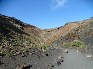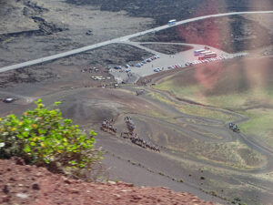 Le premier, le Volcan El Cuervo, un beau cratère pas très haut mais bien dessiné, dans lequel on peut descendre à pied à travers un sentier très facile…. Comptez 45 minutes aller-retour depuis le parking, peu de monde le matin, des vues à couper le souffle sur et dans le volcan, et autour sur le Parc National de Timanfaya. Timanfaya, c’est le 2e volcan de notre journée, le plus emblématique de Lanzarote… donc forcément le plus couru.