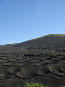 Et petite pause sur la route du retour dans une Bodega de la Geria pour acheter de quoi goûter le vin local, qui est plus curieux à voir pousser qu’à déguster (bon mais sans plus) – les vignes sont plantées dans des trous faits dans la terre noire des volcans, entourées par un demi-cercle de pierre pour les protéger du vent -.
