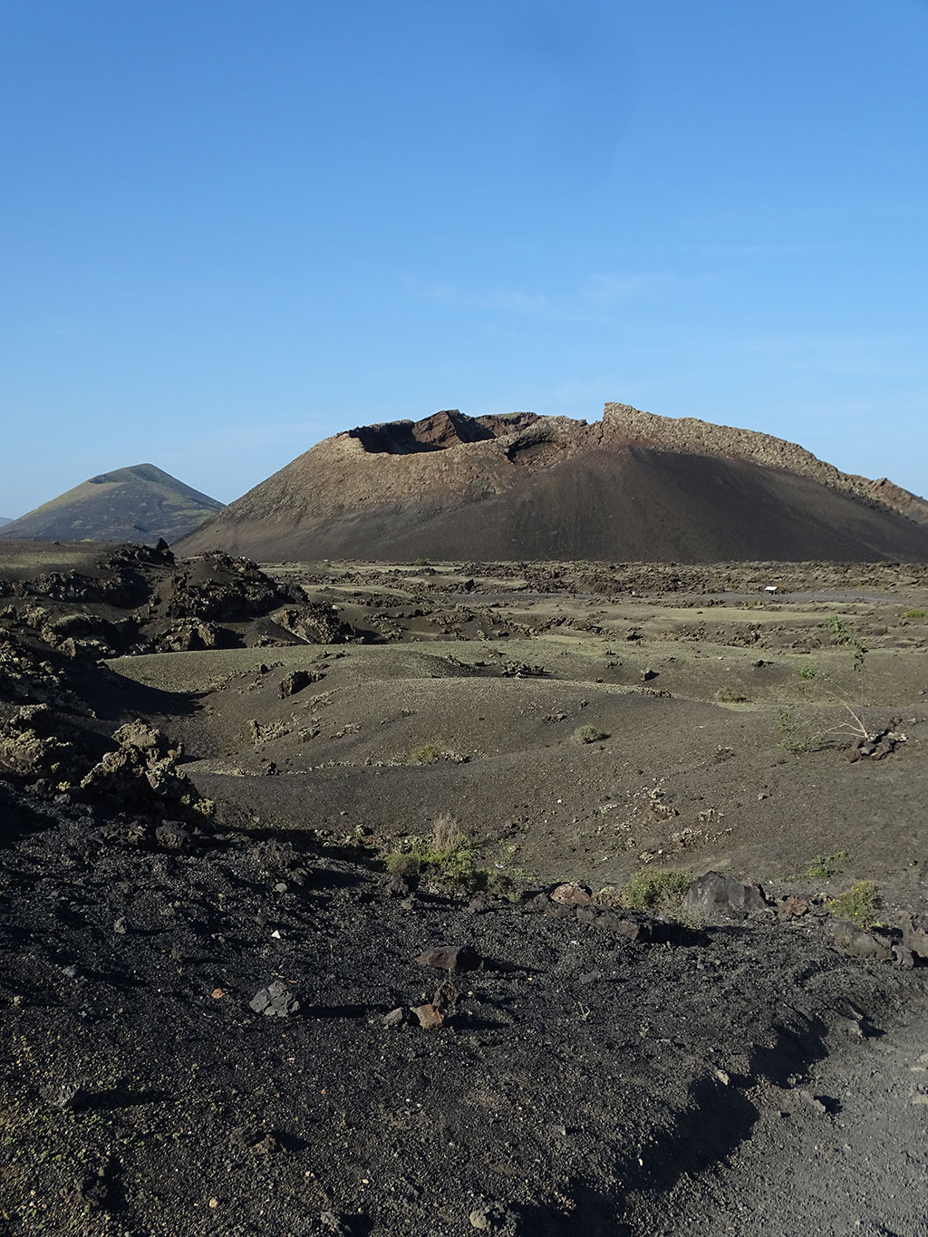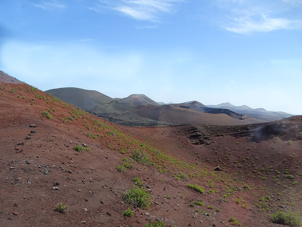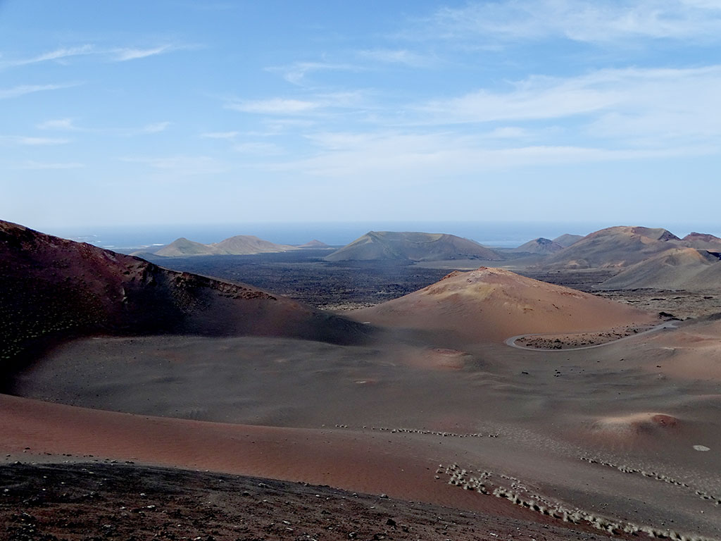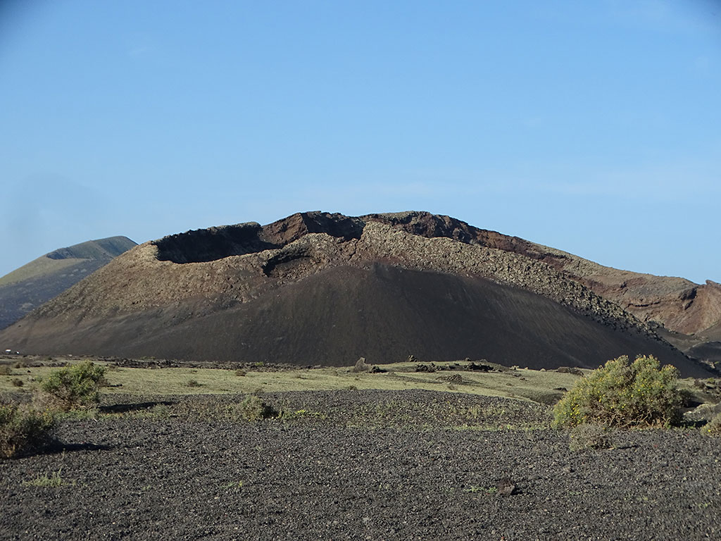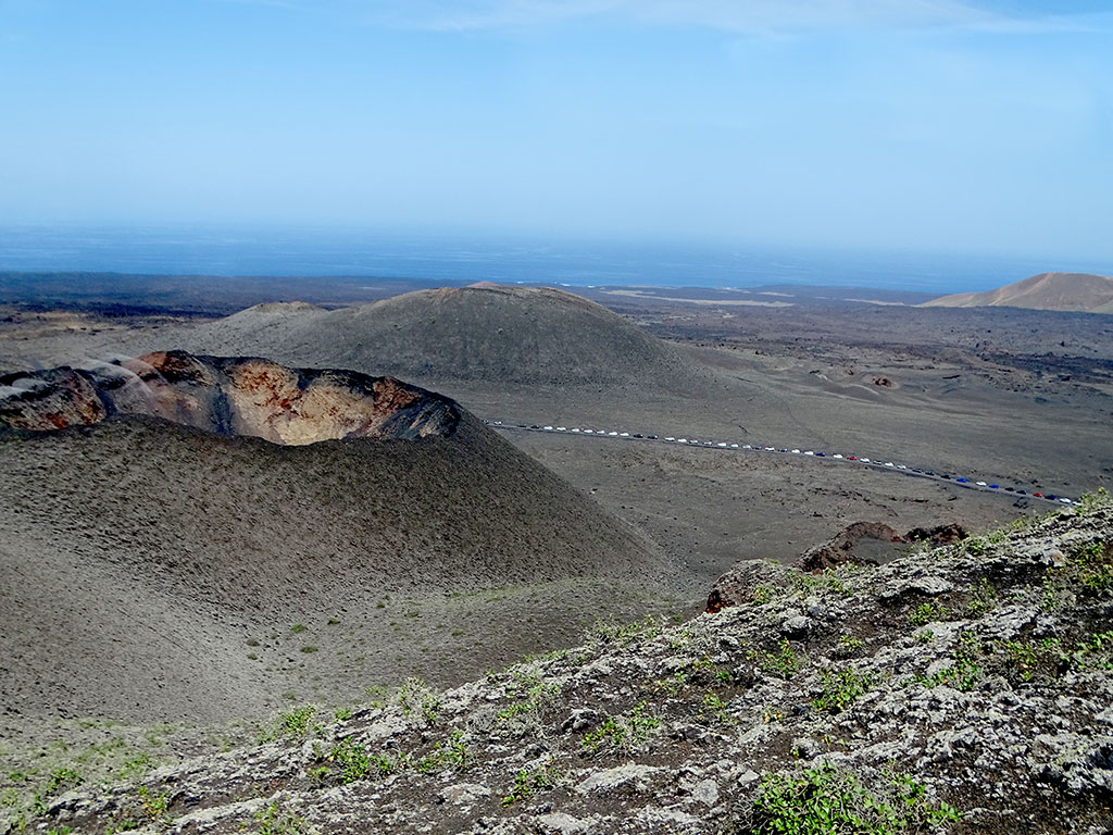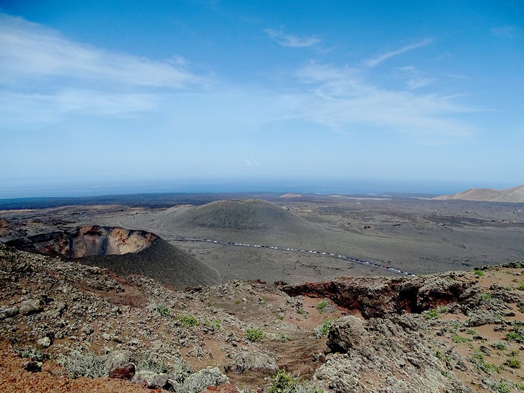 Le premier, le Volcan El Cuervo, un beau cratère pas très haut mais bien dessiné, dans lequel on peut descendre à pied à travers un sentier très facile…. Comptez 45 minutes aller-retour depuis le parking, peu de monde le matin, des vues à couper le souffle sur et dans le volcan, et autour sur le Parc National de Timanfaya. Timanfaya, c’est le 2e volcan de notre journée, le plus emblématique de Lanzarote… donc forcément le plus couru.