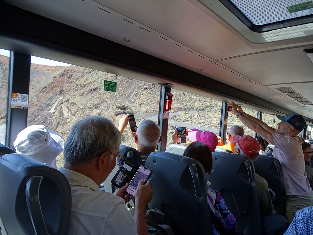… S’entasser dans un bus pour une visite contrainte de 35 minutes, guidée en anglais et en espagnol… où les 46 autres passagers s’extasient derrière les vitres (pas le droit de descendre) devant chaque mini cratère (euh, ce matin on a marché dans un 2 fois plus grand !)…
