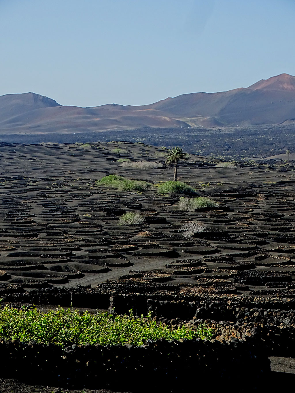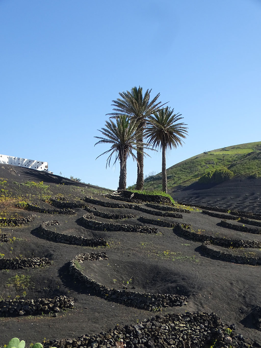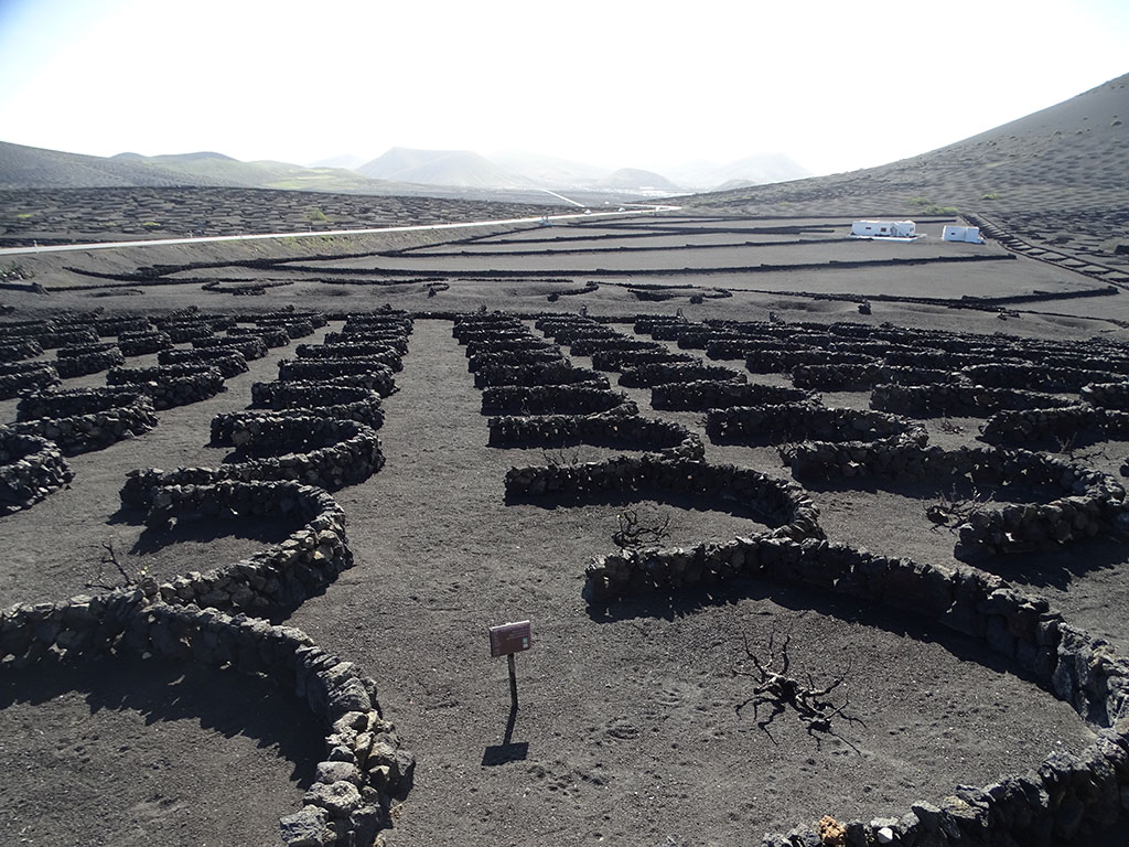 Et petite pause sur la route du retour dans une Bodega de la Geria pour acheter de quoi goûter le vin local, qui est plus curieux à voir pousser qu’à déguster (bon mais sans plus) – les vignes sont plantées dans des trous faits dans la terre noire des volcans, entourées par un demi-cercle de pierre pour les protéger du vent -.